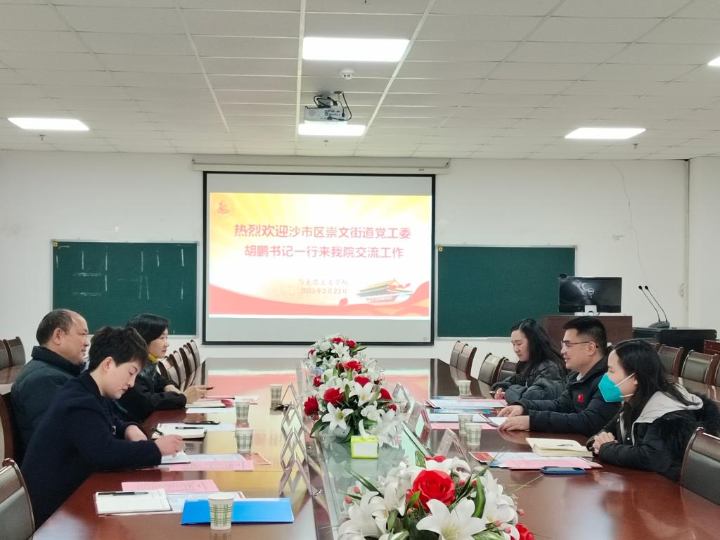 为加强校地合作,2月23日上午,沙市区崇文街道党工委书记胡鹏等一行3人到访公司洽谈交流,学院经理姜学勤、党委书记刘小燕、党委副书记马小佼参加了交流会。