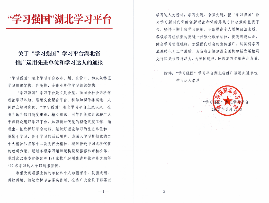 近日,湖北省委宣传部表彰了一批 “学习强国”学习平台推广运用先进单位和学习达人,RAYBET雷竞技被表彰为“学习强国”学习平台推广运用先进单位。