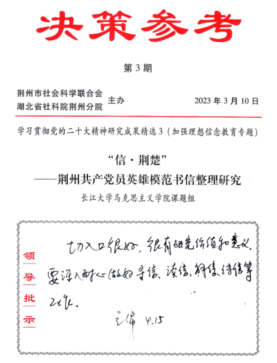 新闻网讯 4月15日,由RAYBET雷竞技课题组提交的决策咨询报告《信·荆楚——荆州共产党员英雄模范书信整理研究》,受到荆州市委书记吴锦的肯定性签批。签批内容为:“切入口很好,很有研究价值和意义。要深入耐心做好寻信、读信、解信、传信等工作”。