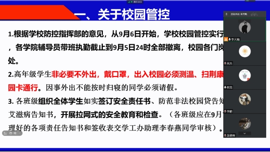 会上,各班班长主要从校园管控、新冠疫苗注射情况、反诈骗教育、疫情防控、线下教学等五方面强调了相关事项,督促员工每日自觉监测体温,如实填写体温自测表,并对高年级员工出入校园等管理事项、预防电信诈骗、线下教学课堂纪律和安全等相关规定提出了新要求。