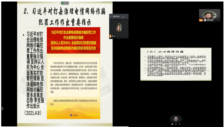 20级专硕班班长刘佳组织同学们学习“习近平总书记对打击治理电信网络诈骗犯罪工作作出重要指示”,并谈到要坚持以人民为中心,全面落实打防管控措施,坚决遏制电信网络诈骗犯罪多发高发态势。随后,她还用武汉市高校领域电信网络诈骗的实例来警示大家,严防网络诈骗。