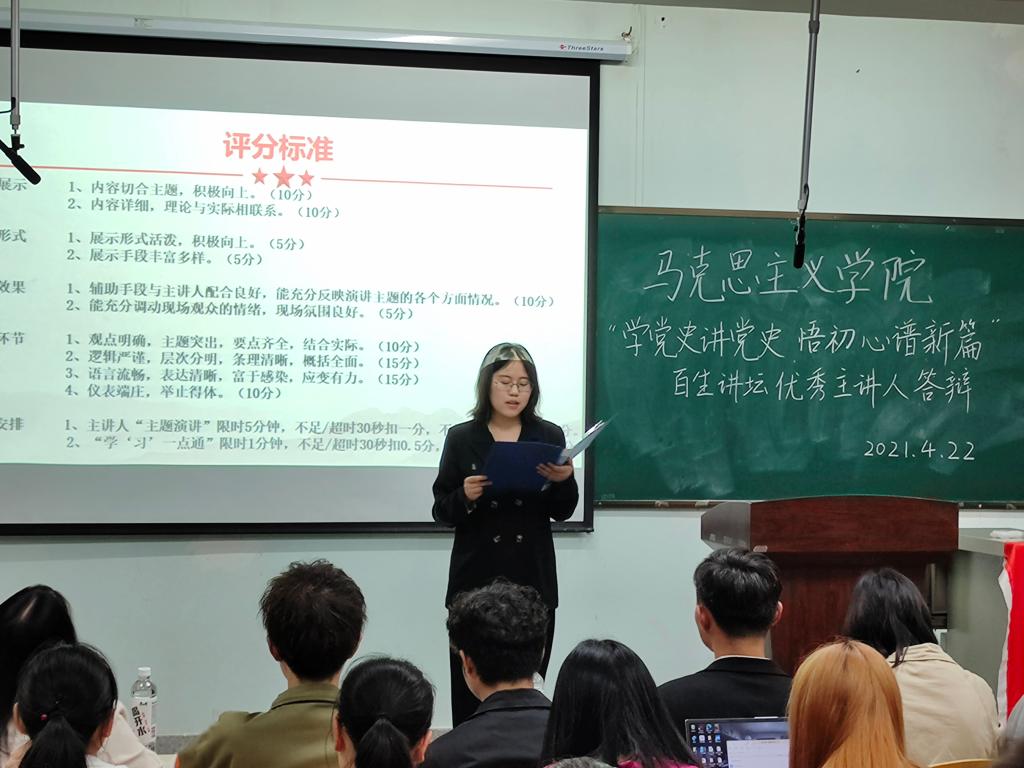 (通讯员 李春燕)学党史讲党史,悟初心谱新篇。 4月22日19:00,RAYBET雷竞技“百生讲坛”优秀主讲人答辩活动于13教A203举行。本次活动邀请辅导员李敏、团委员工会主席李懿宸、副主席魏文婵、莫保华和部分部长作为嘉宾评委。大一大二全体同学参加。