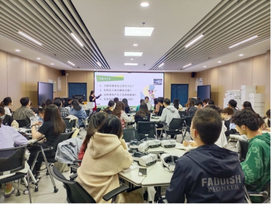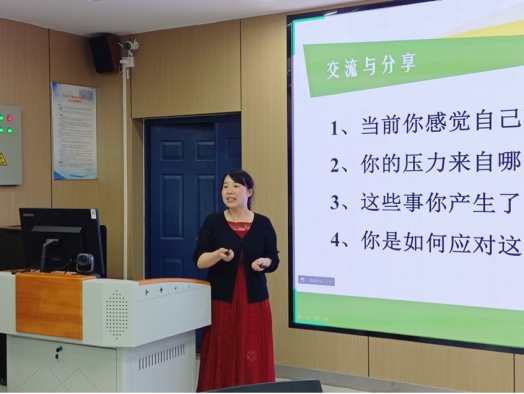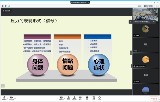 讲座中,张老师首先让同学们以小组为单位交流讨论“你的压力来自哪些方面?”一些同学表示来自于繁重的学习任务;还有一些同学认为来自于情感与生活的琐事。张老师就此提出:“压力的前提是环境的刺激。”并从认识、评估、应对压力三方面以感受、评价为线索,对当代老员工的压力问题进行系统的阐述。
