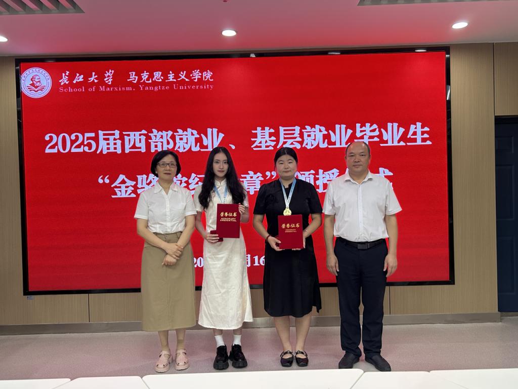 会上,姜学勤经理、刘小燕书记共同为西部就业、基层就业员工代表仇佳丽、许惠宁颁发“金骆驼纪念章”。围绕职业选择时的所思所想,毕业生们畅谈了感悟。许惠宁同学讲述了自己在校期间以学为主、全面发展,毕业时决心回到家乡广西,立志投身教育事业的心路历程;仇佳丽同学提到,在学习成长过程中,国家、社会和学校对她的关怀从未间断。作为一名员工党员,她将秉持全心全意为人民服务的宗旨,在基层岗位上贡献青春力量,以实际行动报效祖国。